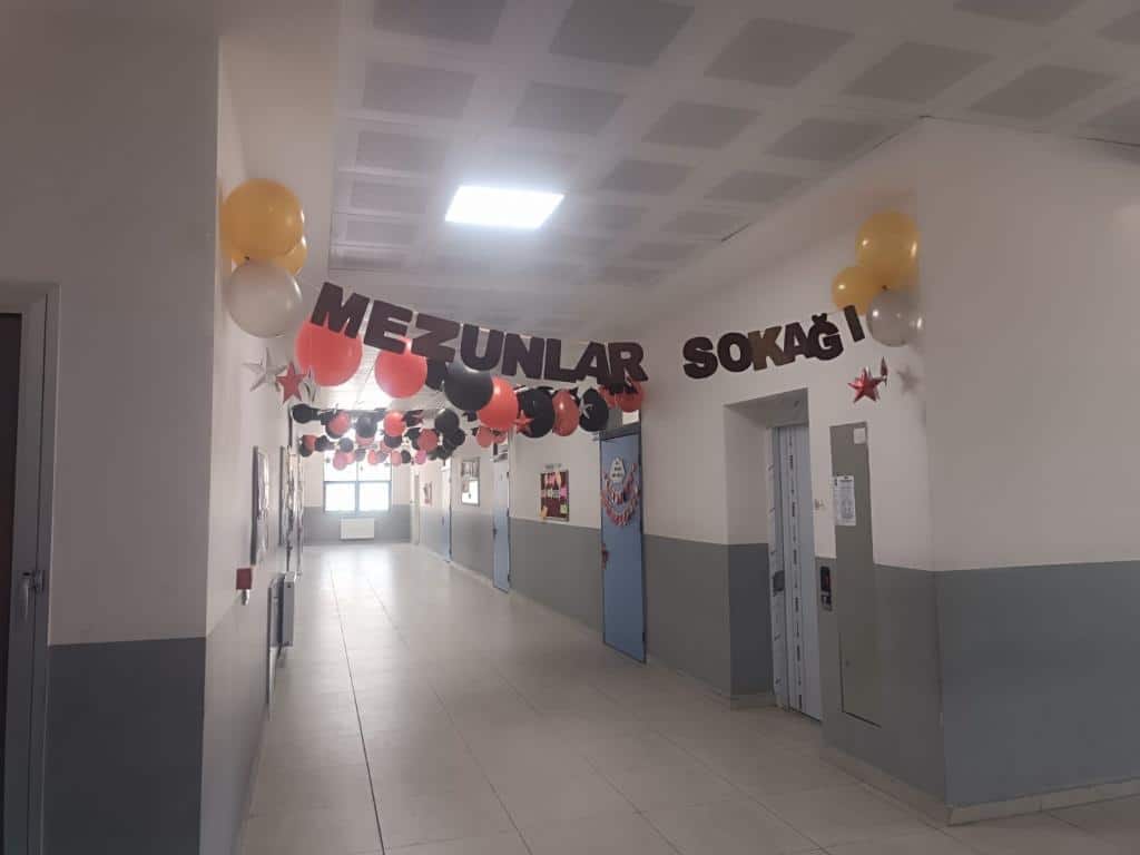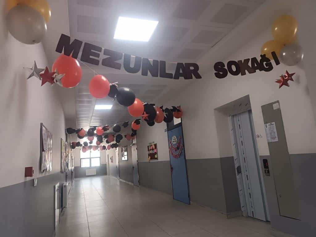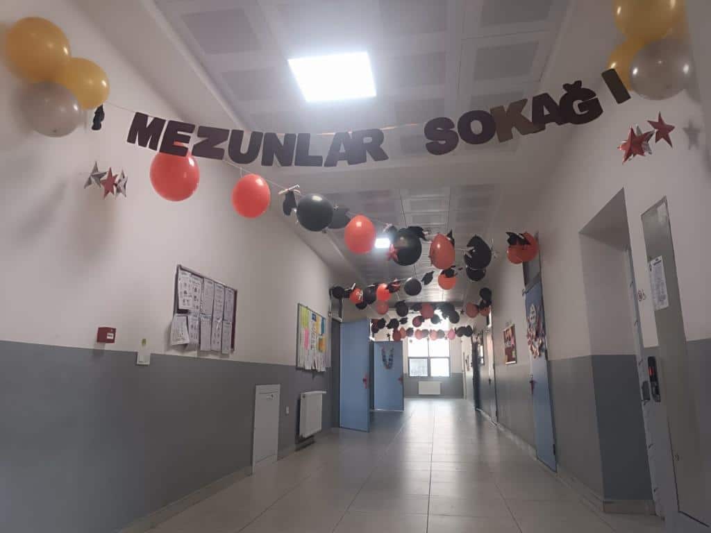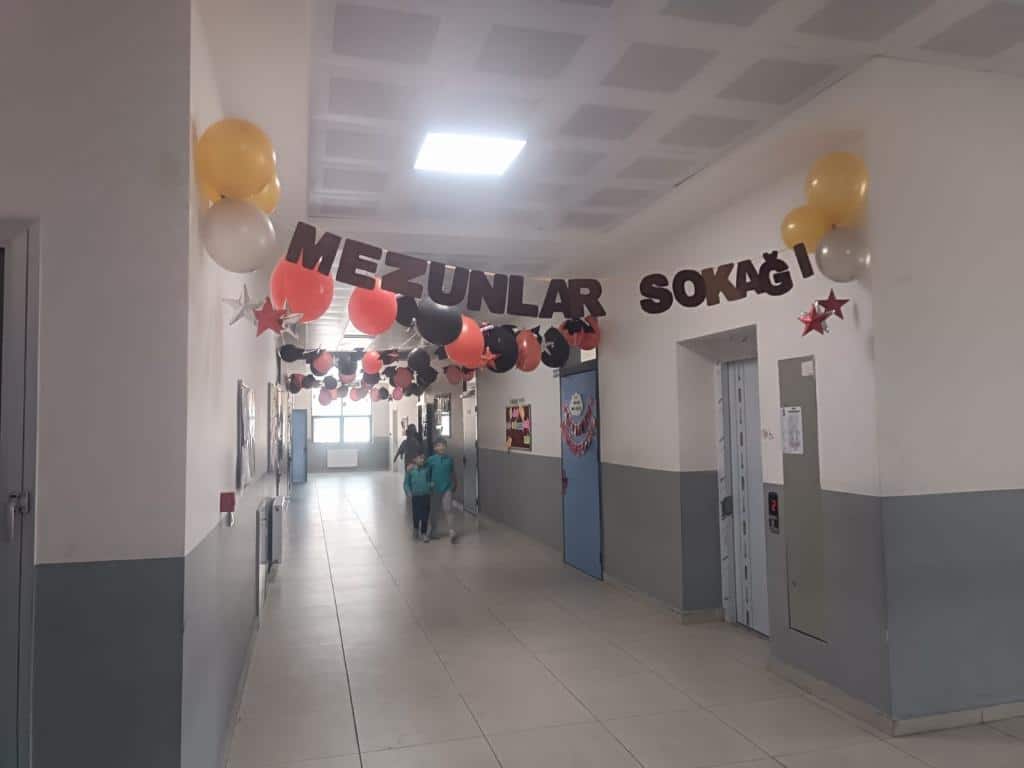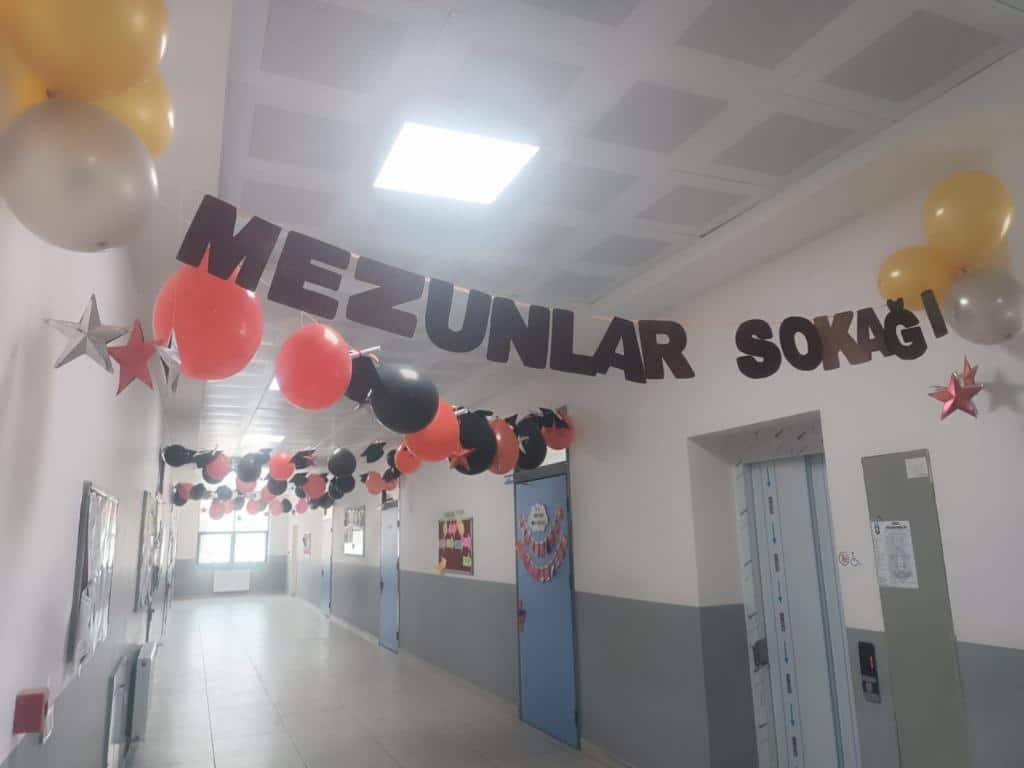 Okulumuzda 4. sınıftan mezun olarak ortaokula geçecek olan öğrencilerimiz için, Rehberlik Servisi tarafından hazırlanan 'Mezunlar Sokağı' temalı koridor süslemesi ile anlamlı bir veda alanı oluşturuldu. Balonlar, Kep süslemeleri ve neşeli detaylarla donatılan bu alan, öğrencilerimizin emeklerini ve gelişim yolculuklarını simgeliyor..